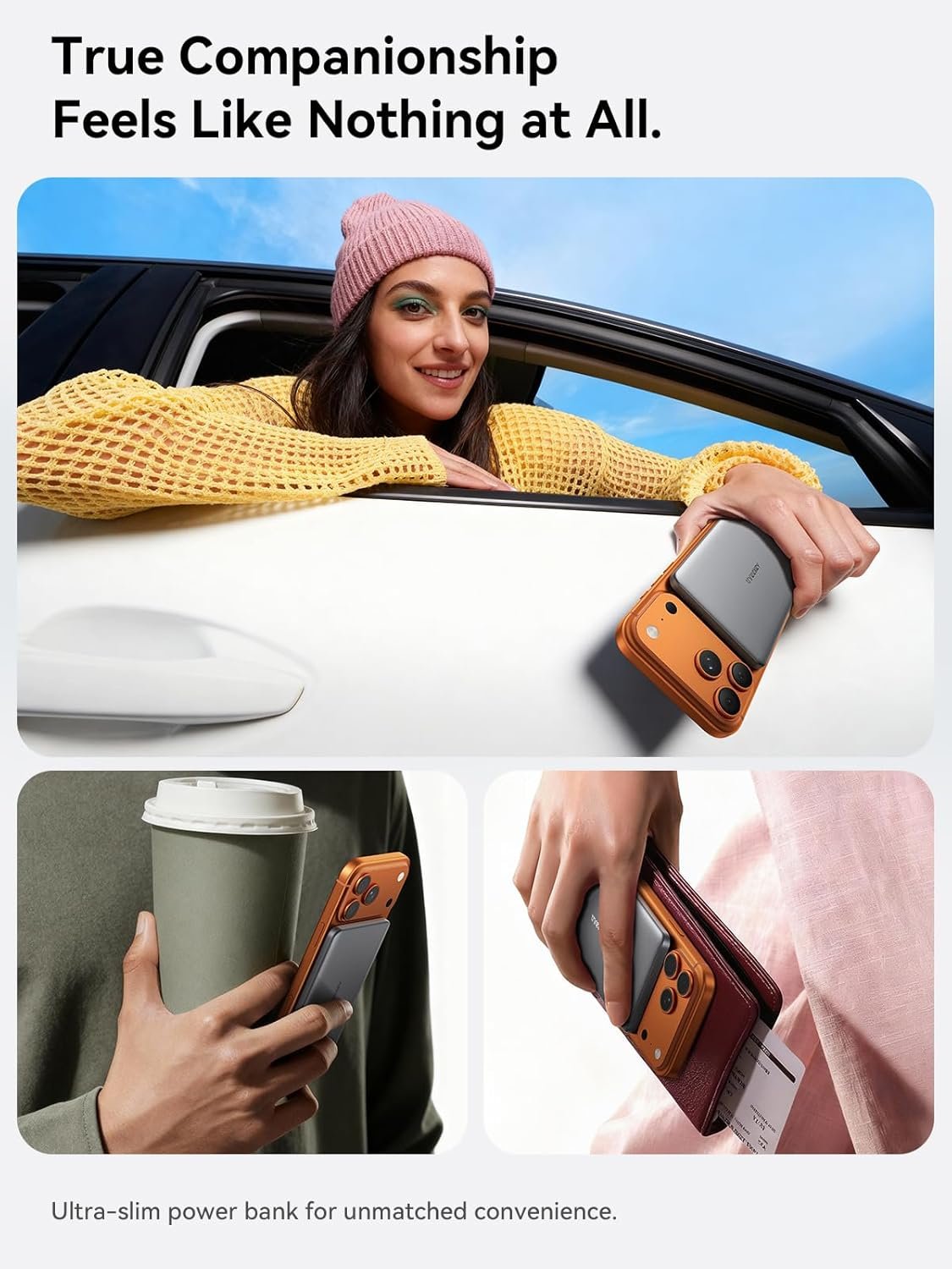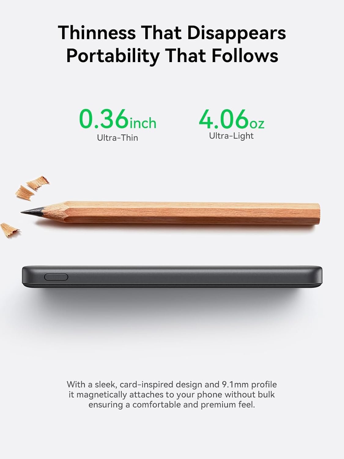 Despite this high capacity, the design of the THREEKEY Portable Magnetic Wireless Power Bank remains remarkably slim and light — as thin as a credit card in some variants.