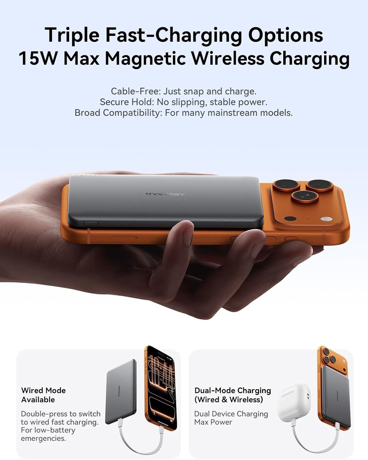 Whether you’re prioritizing portability, charging flexibility, or reliability, the THREEKEY Portable Magnetic Wireless Power Bank is a strong choice for anyone looking to stay powered up without compromises, especially on the go.